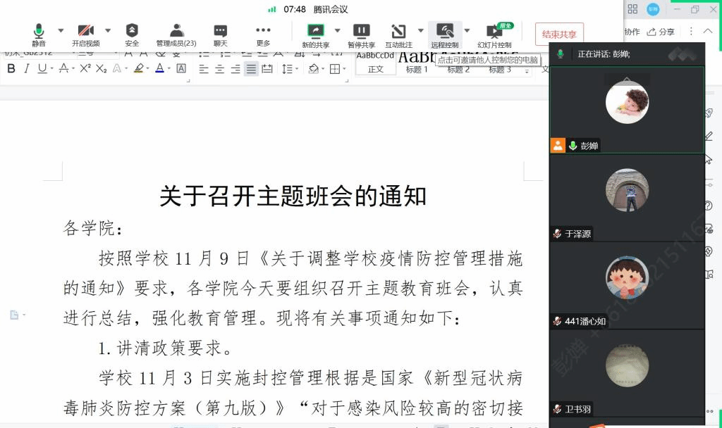 为响应学校的防疫要求,提高同学们的安全防范意识,我院于2022年11月9日组织各班开展“调整学校疫情防控管理措施”主题班会。