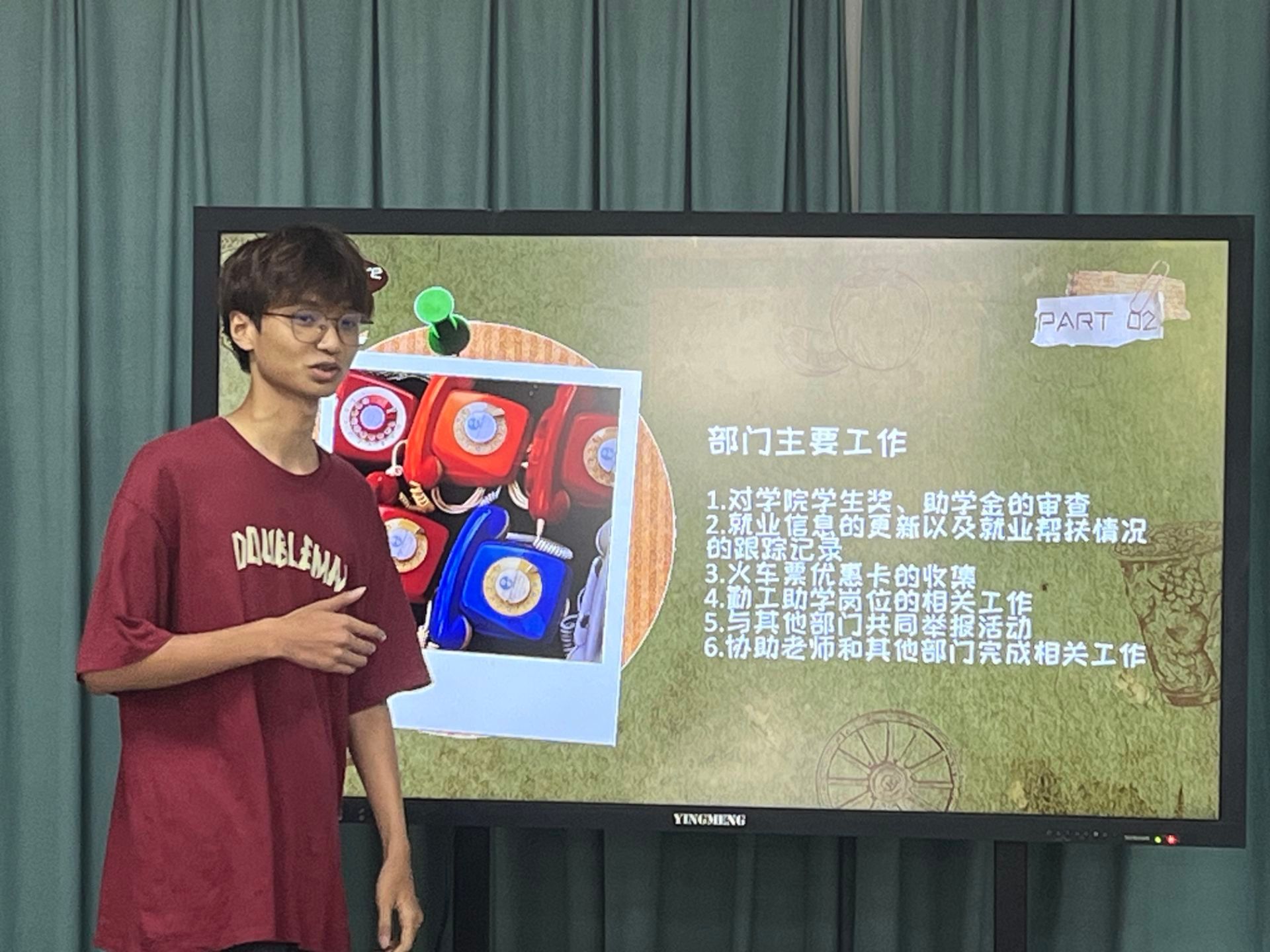 此次换届答辩共有49名竞选候选人参加。按照抽签顺序,各竞选候选人依次上台进行5分钟答辩,答辩内容包括自我介绍、工作经历、岗位认知、未来工作计划等,个人陈述完毕后,老师和现任学生干部对他们进行提问。