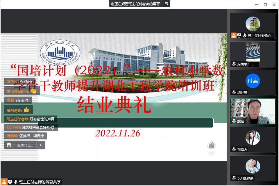 11月26日上午,由我院承办的“国培计划(2022)”——农村小学数学骨干教师提升培训(A026 小学数学)Beat365唯一官方网站培训班顺利结业。Beat365唯一官方网站继续教育学院院长涂国平、Beat365唯一官方网站院长肖应雄教授、项目负责人胡付高教授,以及来自宜昌市、黄冈市、襄阳市、咸宁市、孝感市的100位参训学员通过腾讯会议参加了结业典礼。