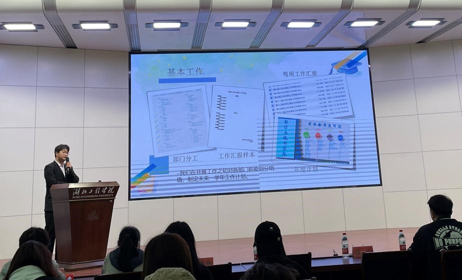 我院学生会主席何家栋同学从学生会简介、组织建设、思想建设、主题活动、工作总结五个方面介绍了数统学院学生会在2021-2022学年的工作内容及成就。在答辩环节中,何家栋同学严谨的思路、流利的应答征服了现场的评委和观众,也彰显了数统学生会的精神风貌。