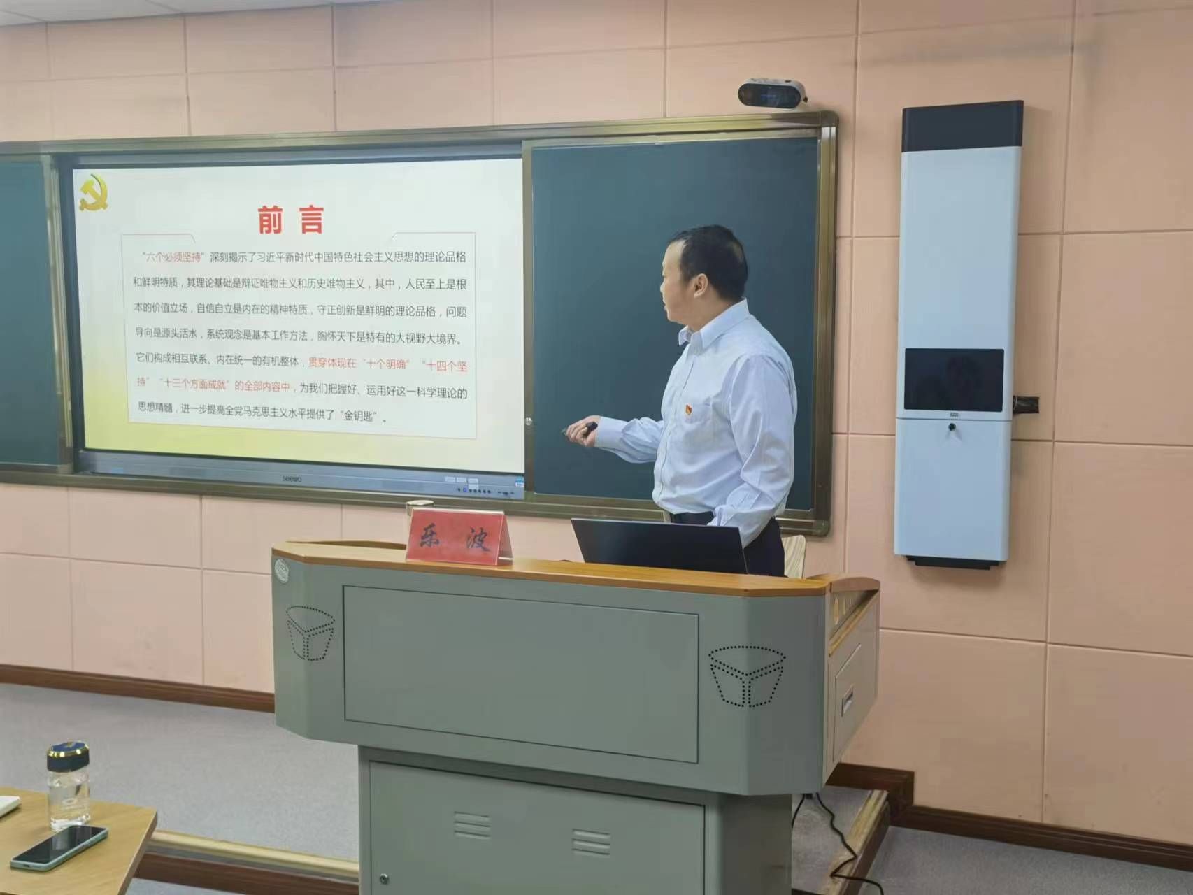 第二个阶段,专家辅导报告,王晶主持讲座。学院特邀马克思主义学院院长乐波教授为大家作了题为《习近平新时代中国特色社会主义思想的世界观和方法论》专题报告。乐教授从习近平新时代中国特色社会主义思想世界观和方法论的实践依据;科学内涵;丰富发展三大块作了一场生动而振奋人心的报告。