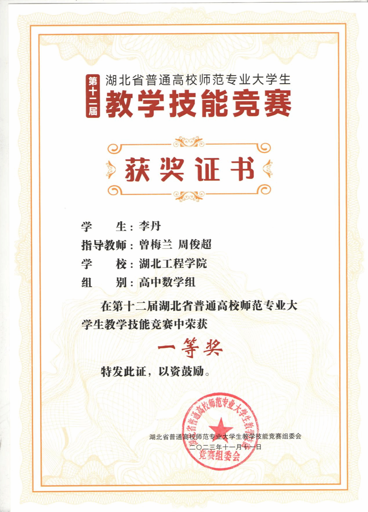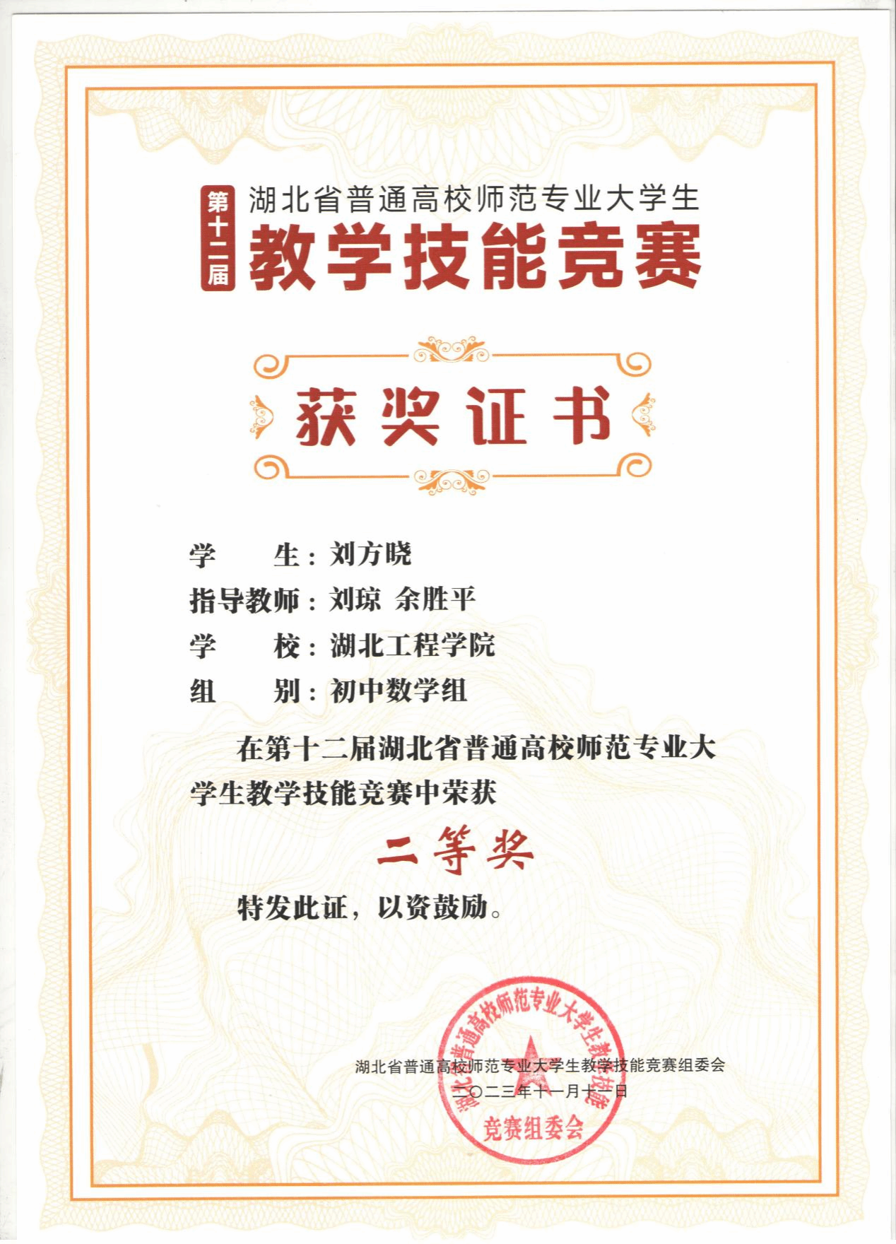 2023年11月11日,第十二届湖北省普通高校师范专业大学生教学技能竞赛决赛在华中师范大学圆满落幕,我院两名数学与应用数学专业学生在全省十几所参赛高校中脱颖而出,创我院参加此项赛事以来最好成绩,其中李丹获得高中数学组一等奖(指导老师:曾梅兰、周俊超),刘方晓获得初中数学组二等奖(指导老师:刘琼、余胜平),充分展现了我院数学与应用数学专业学生扎实的专业知识、教学技能和综合素养。